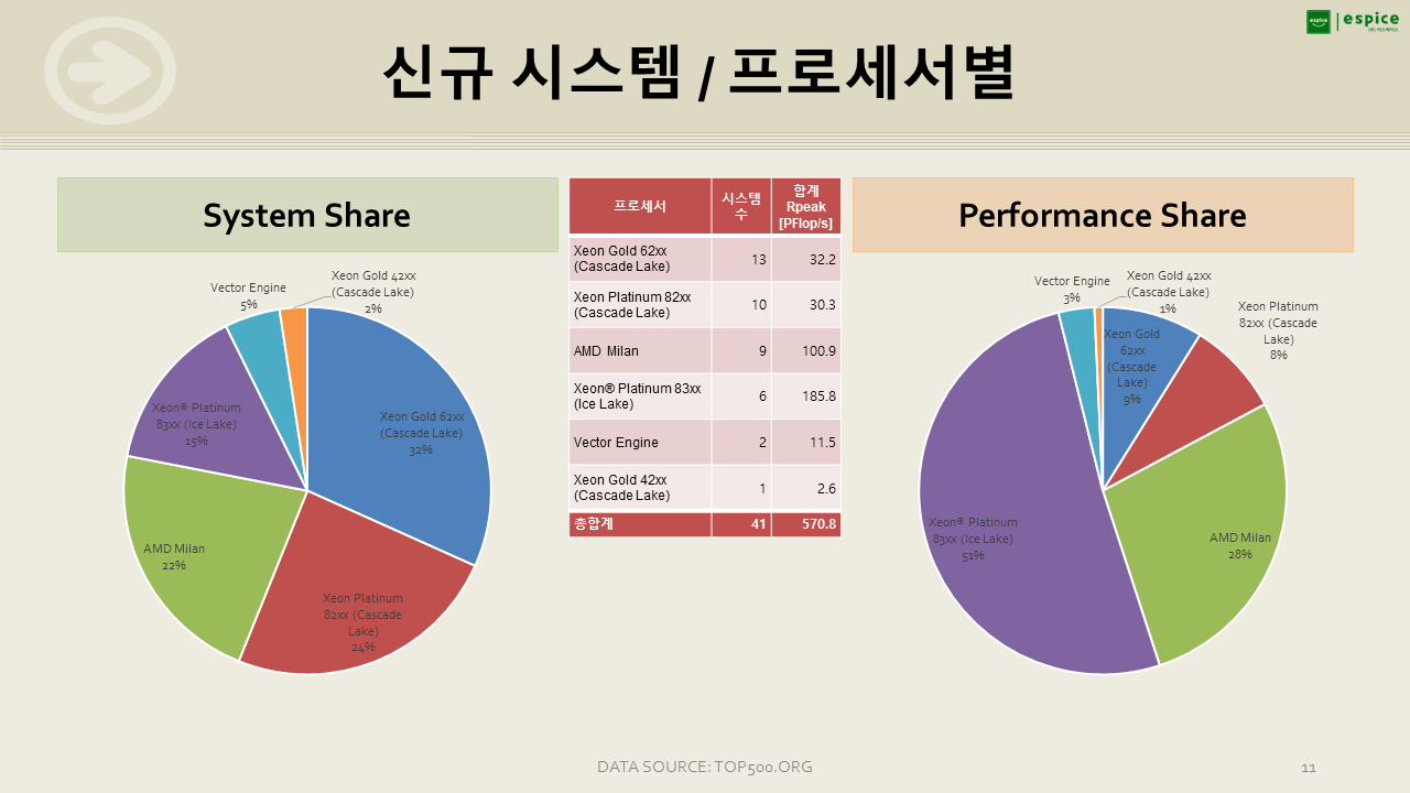 새로운 시스템 중에서도 AMD Milan의 상당한 강세인데, Xeon Platinum 83xx + NVIDIA A100으로 구축된 대형 시스템이 몇 대 진입하면서 Xeon Platinum 83xx의 점유율이 꽤나 커진 점도 특이합니다.
