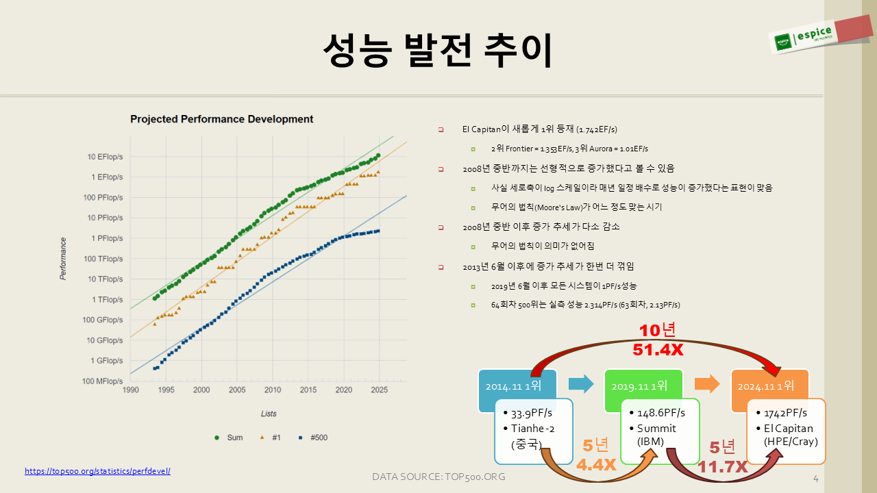 한편, 현재 500위 시스템의 성능은 과거 2011년경의 1위 성능에 해당할 정도로, 전체 시스템 성능이 비약적으로 향상되었습니다. 또한, 전체 합계 성능과 1위 시스템의 성능 간 격차가 점점 줄어들고 있어, 상위 시스템의 성능이 더욱 압도적으로 커지고 있음을 보여줍니다.