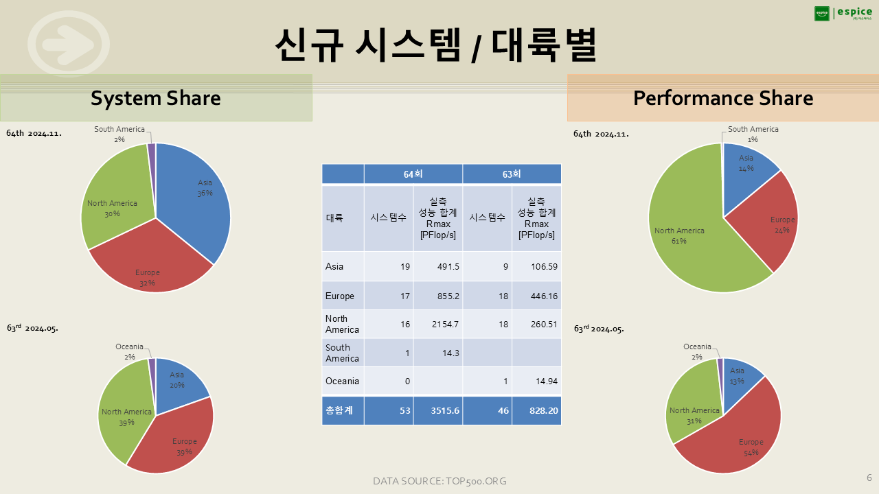북미, 아시아, 유럽에서 신규 등재된 시스템 수는 대체로 비슷한 수준을 보입니다. 다만, 1위 시스템을 보유한 미국은 성능 점유율에서 여전히 압도적인 우위를 유지하고 있습니다.