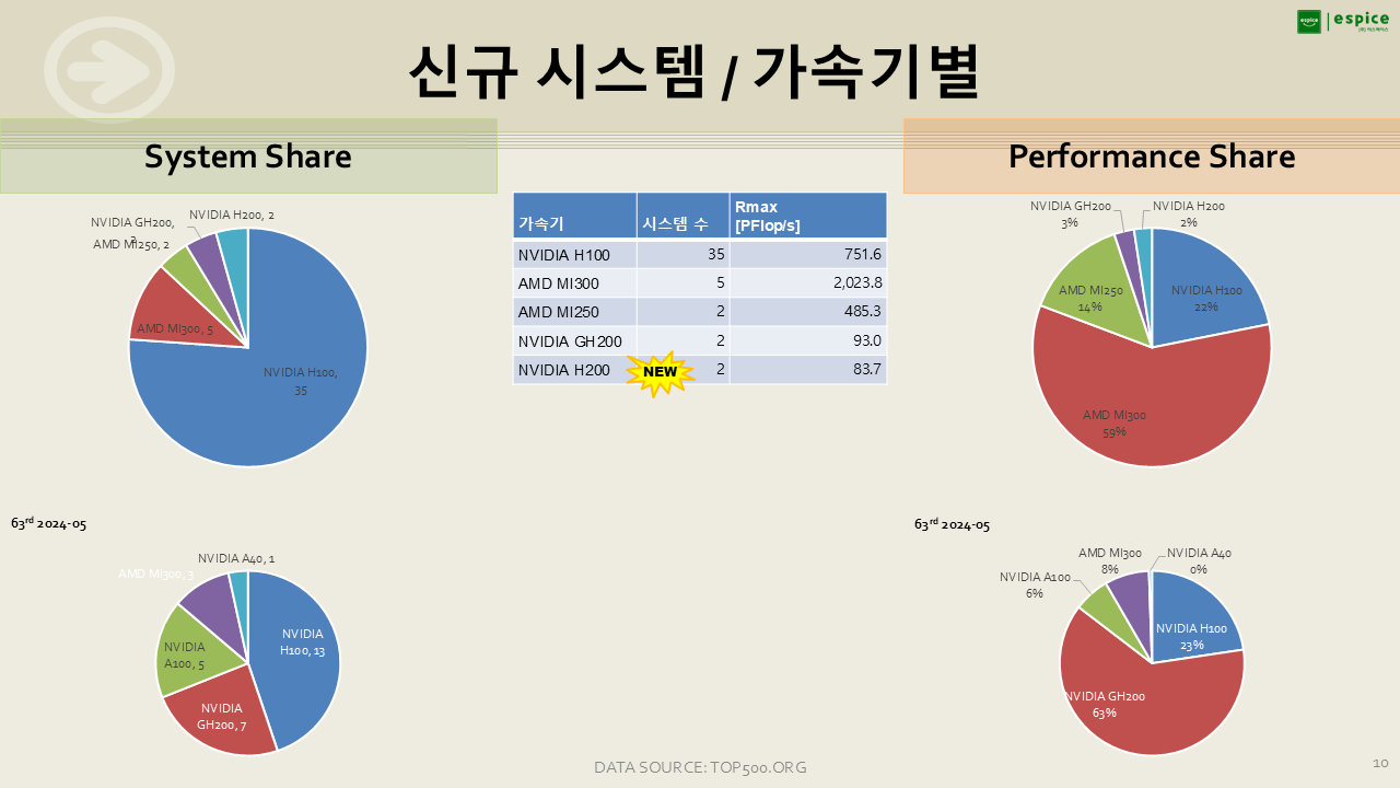 수량 면에서는 NVIDIA 가속기가 여전히 강세를 보이고 있지만, AMD 가속기는 HPE/Cray의 초대형 시스템에 채택되면서 성능 점유율에서 압도적인 존재감을 드러내고 있습니다.