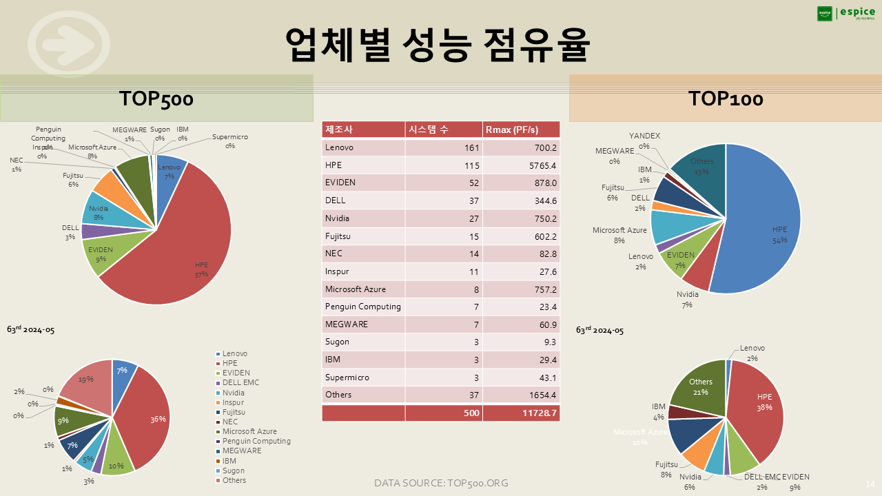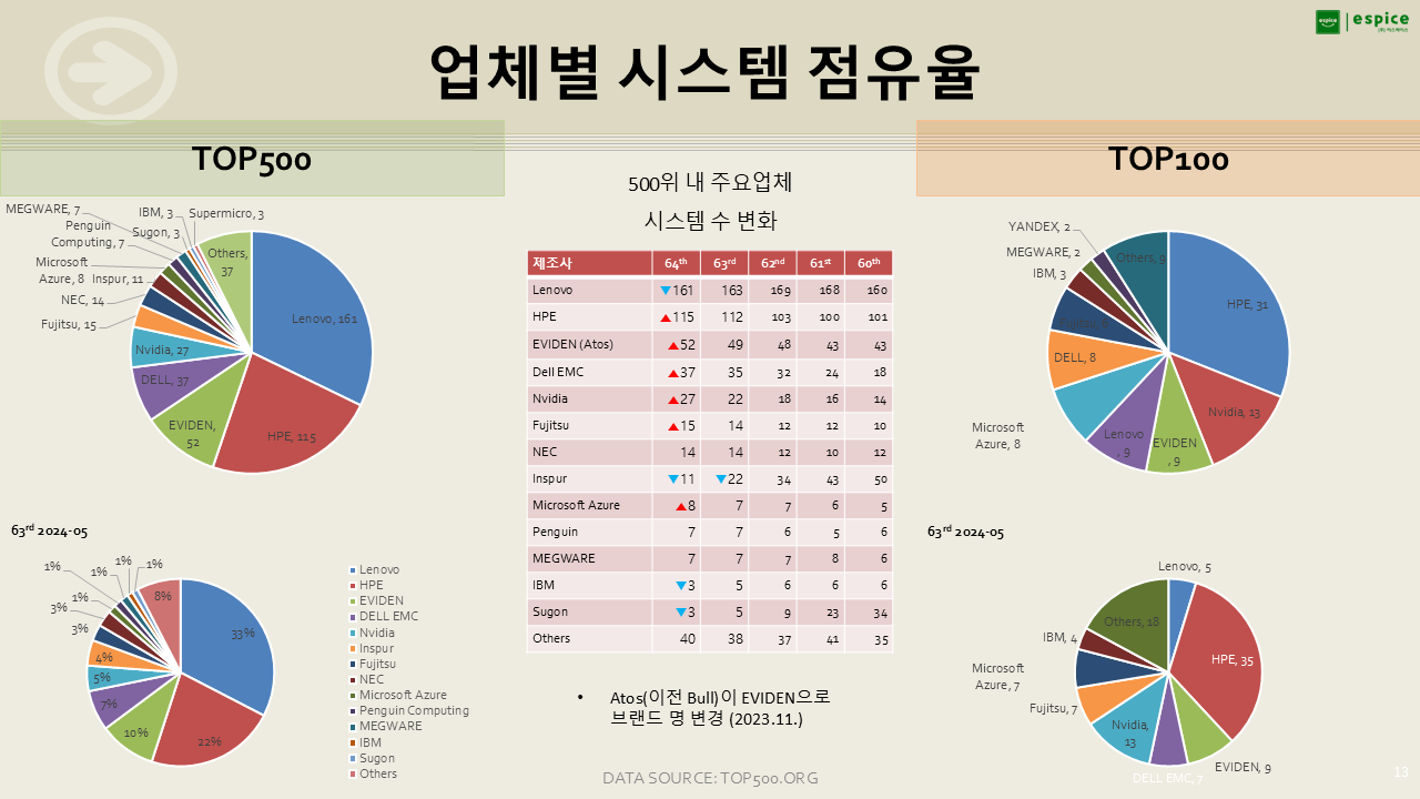 실제 자료에서는 HPE로 표기되어 있지만, 이는 Cray를 인수한 HPE이며, HPC 분야에서는 여전히 Cray 멤버들이 활약하고 있기에 HPE/Cray로 표기했습니다. HPE/Cray는 글로벌 시장에서 독보적인 위치를 유지하고 있습니다.