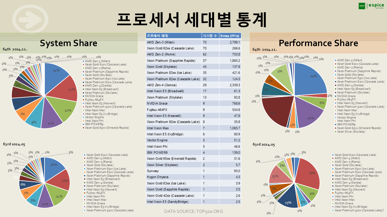 프로세서 세대별 통계를 살펴보면, TOP500 순위가 500위까지 포함되다 보니 여전히 오래된 프로세서도 다수 포함되어 있습니다.