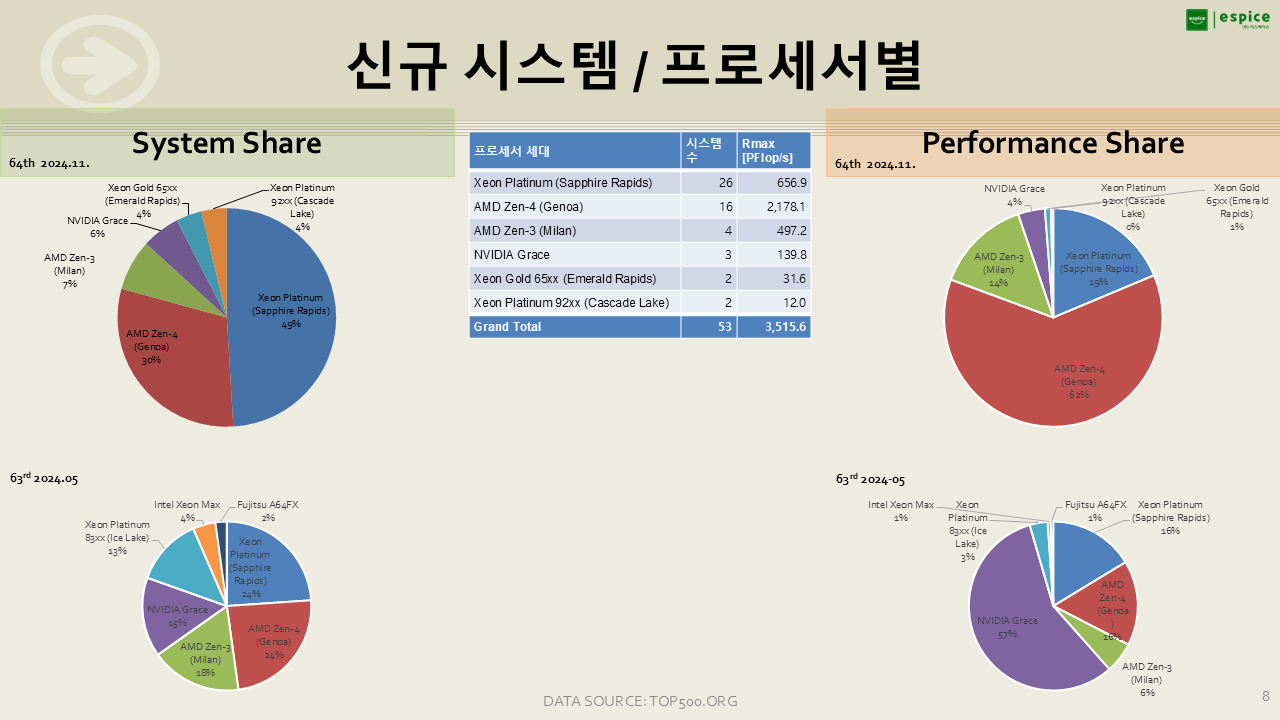 특히, AMD 프로세서의 점유율이 상당히 높다는 점이 눈에 띕니다. 이번 SC24 기간 중 Dell 행사에서 AMD는 전체 서버 시장 점유율이 30%를 넘어섰다고 발표하며, 시장에서의 빠른 성장을 강조했습니다. 이는 AMD의 약진과 더불어 Intel의 상대적인 부진을 보여주는 지표로 해석할 수 있습니다.신규 시스템에서 프로세서별 분류를 봐도 비슷한 양상입니다.