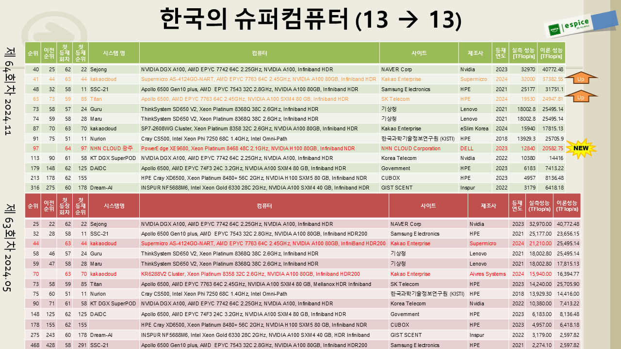 광주 슈퍼컴퓨터 센터에 Dell이 설치한 대형 시스템이 새롭게 등재된 점이 눈에 띕니다. 또한, 카카오와 SKT는 기존 시스템의 성능을 업그레이드하여 향상된 성능 값을 등록함으로써 순위를 높이는 데 성공했습니다. 이전에는 이런 사례가 드물었던 만큼, 매우 고무적인 발전이라 할 수 있습니다.