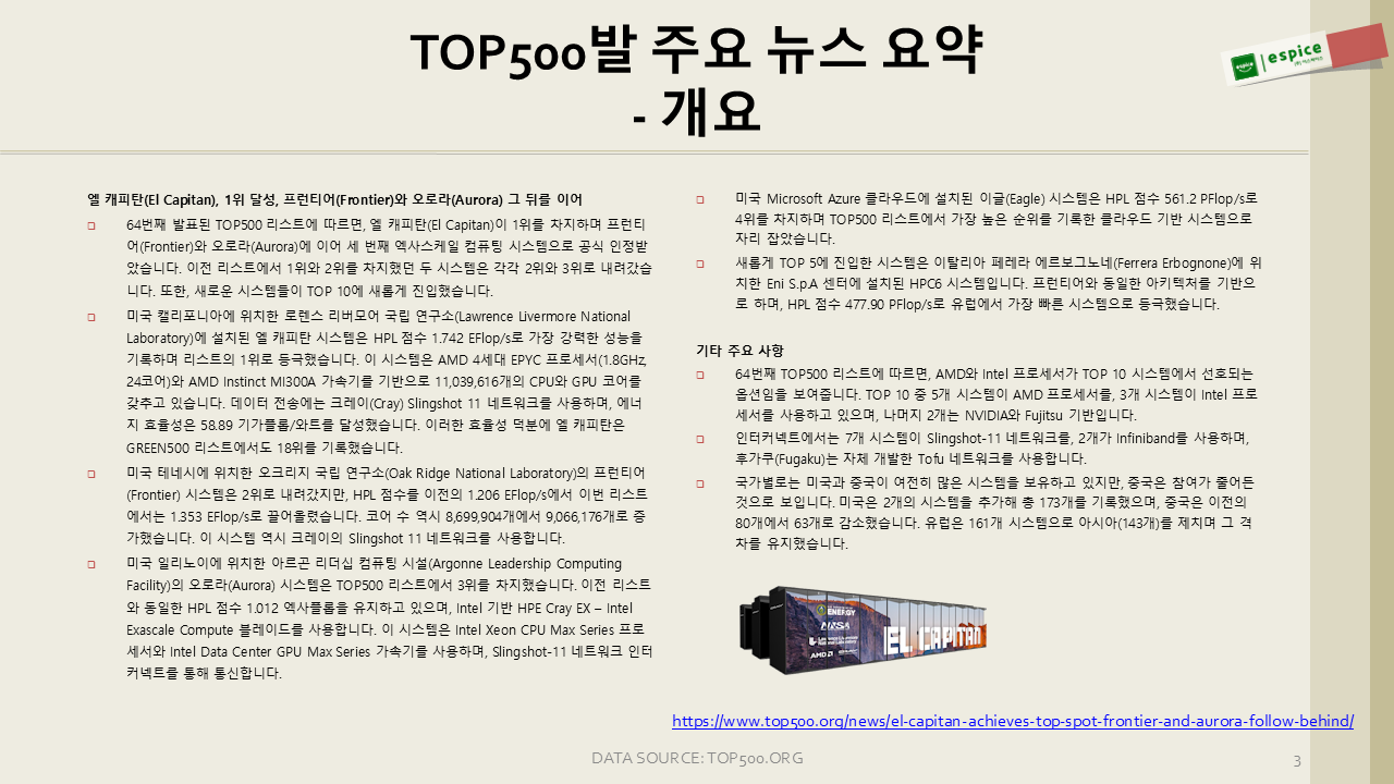 이렇게 이번 64회 TOP500 순위를 훑어보았습니다. 아래는 제 나름의 이번 순위 요약입니다.