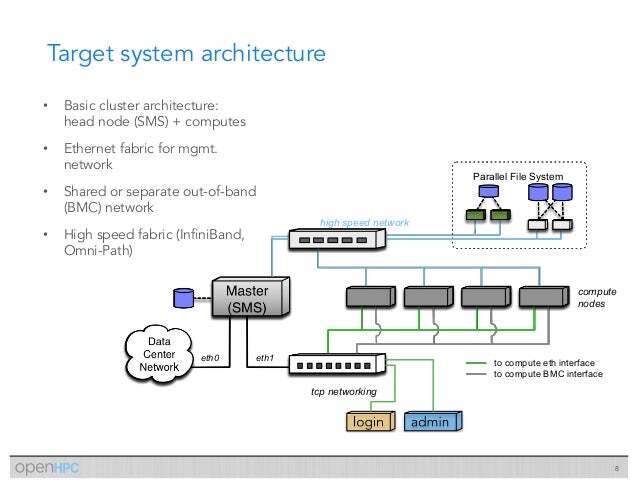아래 그림은 OpenHPC란 솔루션 문서에 포함된 대표적인 HPC 클러스터 구성 예입니다.