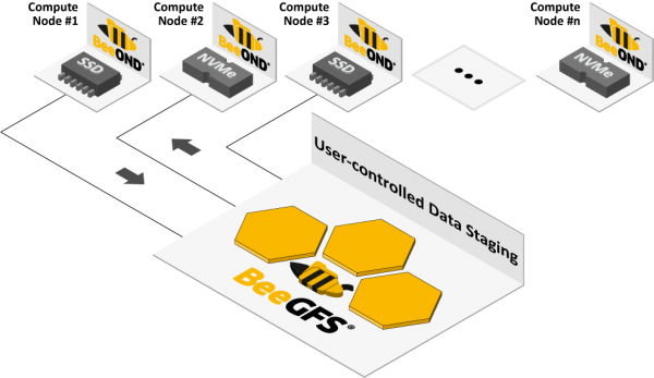 BeeOND는 클러스터 배치 시스템과 통합하여 컴퓨팅 작업의 일부인 컴퓨팅 노드의 내부 SSD/NVMe에 작업별로 임시 병렬 파일 시스템 인스턴스를 생성하도록 설계되었습니다.